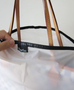 Jetzt ist Ihr Handtasche Regenschutz leicht an der Außenseite Ihrer Handtasche befestigt.